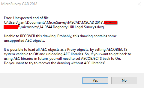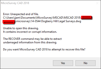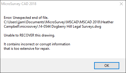 However occasionally the problem has occurred with your current working drawing and this is a more serious problem. Following is a hierarchy of steps to follow to attempt to recover the drawing and (if the file was created in MicroSurvey) the database that are so important: